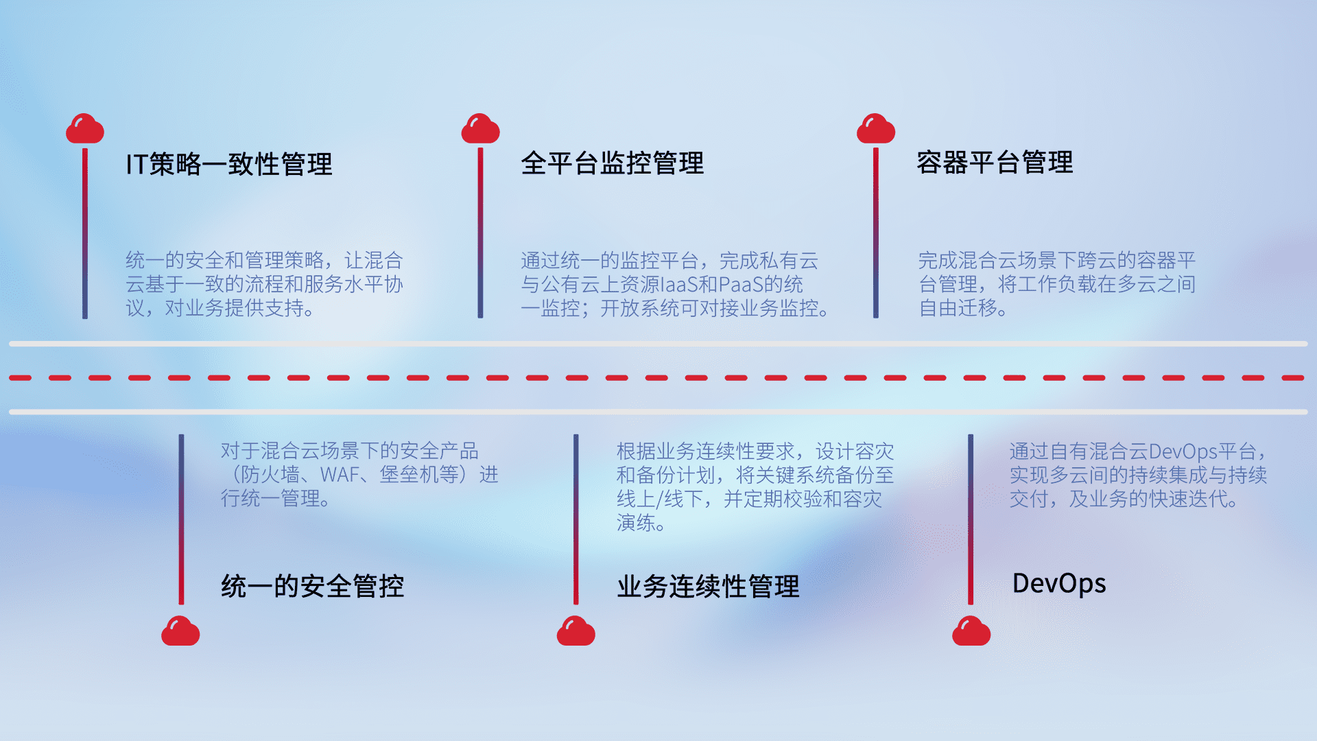 通过多云纳管,,,以统一的资源数据模型把客户的云资源进行抽象和封装,,,,进而实现对多云资源的统一操作,,,保障云资源管理的可靠性、、稳定性与可用性。。量身定制化运维内容,,,,配置、、、开发运维、、、补丁管理、、、、备份、、、、监控、、、、认证和访问管理、、、、审计和日常巡检等,,保障在用云过程中的可靠度,,稳定度以及高可用率。。