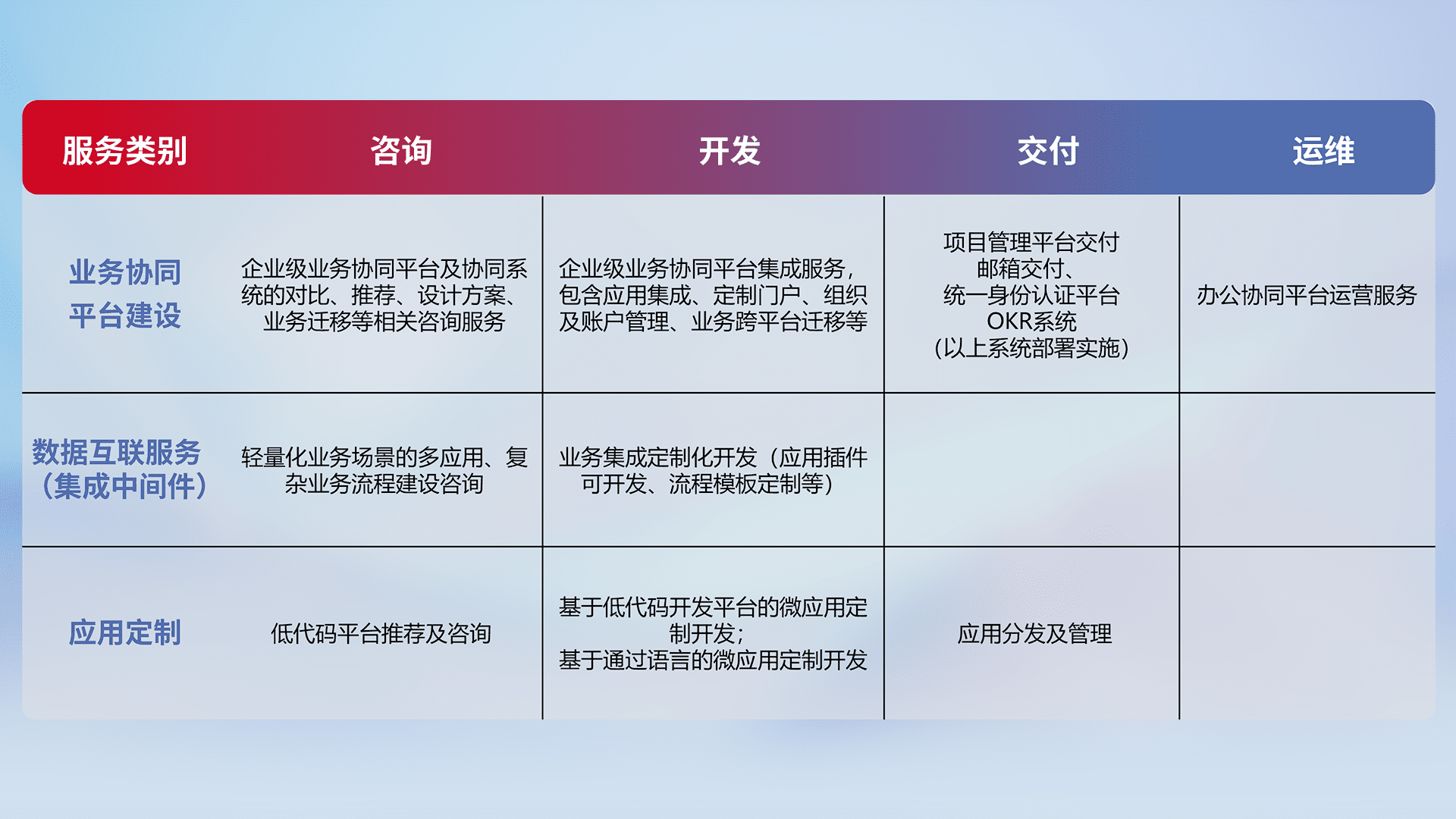 针对钉钉、、企微、、、、IDaas等平台级产品提供产品的规划、、、、方案、、、、交付、、、定制化开发等服务,,,实现如统一协同办公、、、、智能客户服务、、、混合会议管理、、、、智能数据查询、、、等业务场景,,,,实现数字化转型。。。。